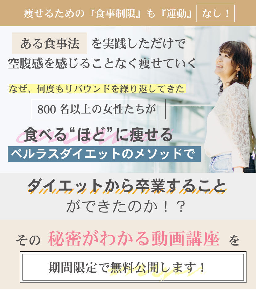 なので、ベルラスダイエットのオンライン講座では、「これは食べちゃダメ」「コレとコレは食べていい」というような制限をする方法をお伝えしていません。