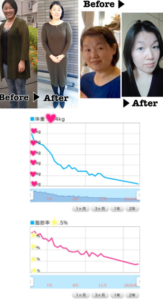 自動的に食事内容が変わった主人も-7キロ、そして内臓脂肪の値が半分になりました!食べると太るというマインドから、食べて痩せられるというマインドに変わり、今まで憂鬱だった夕飯作りも楽しく出来るようになり、仕事に対しても前向きにイキイキと向き合えるようになりました!