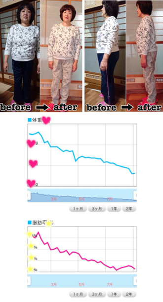 主人に「楽しそうで良いね。」と喜んでくれ、会話やお出掛けが増えました。右足が不自由なので、太っていると左足に半端ない負担がかり、可動域も少なくなって、人と会うことも億劫になり、陰気な自分になって居たと思います。