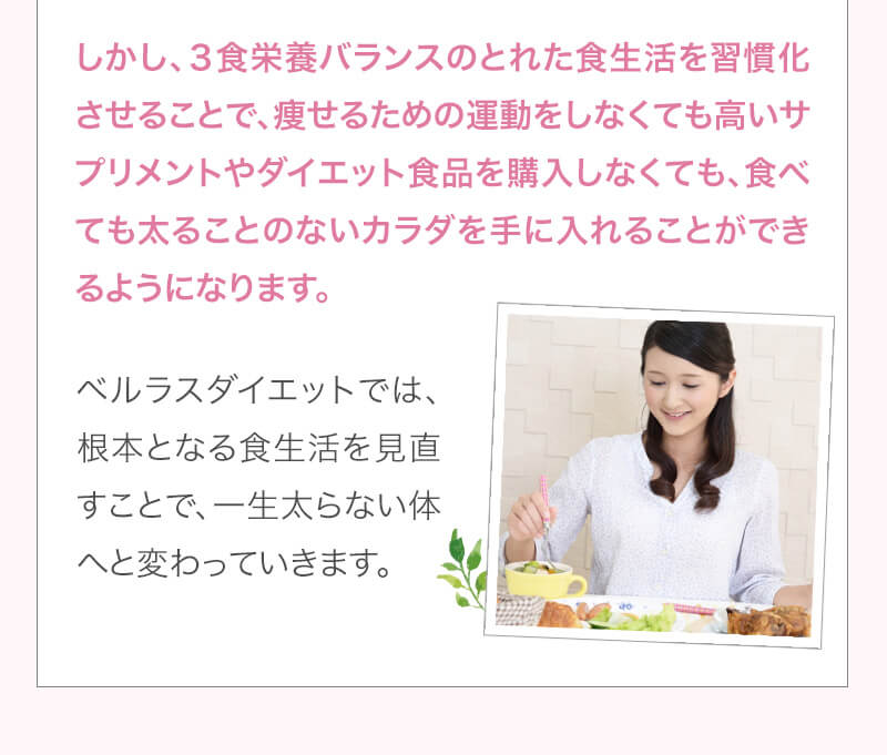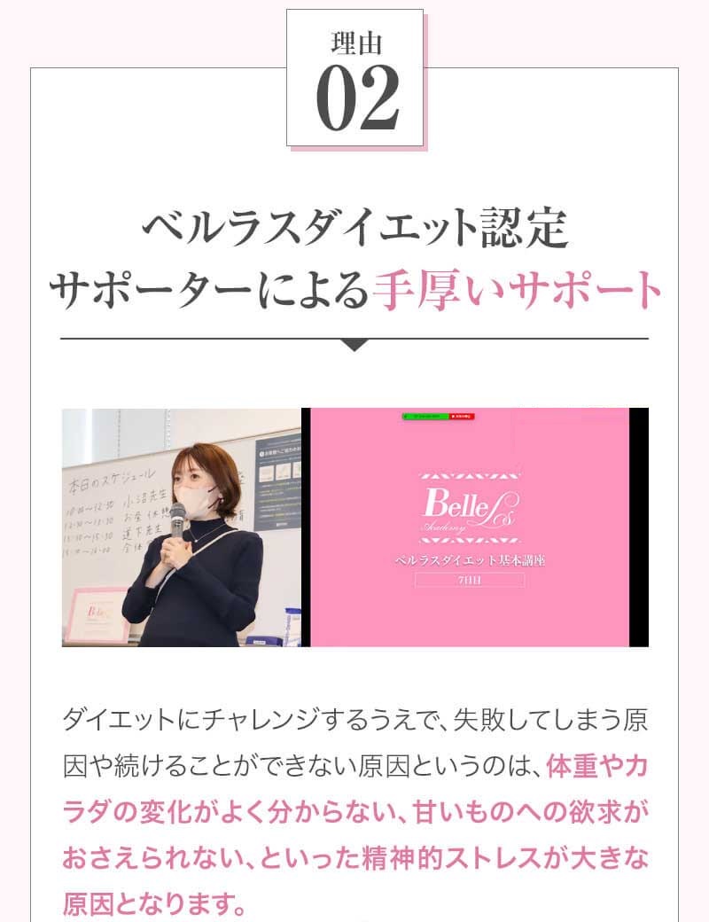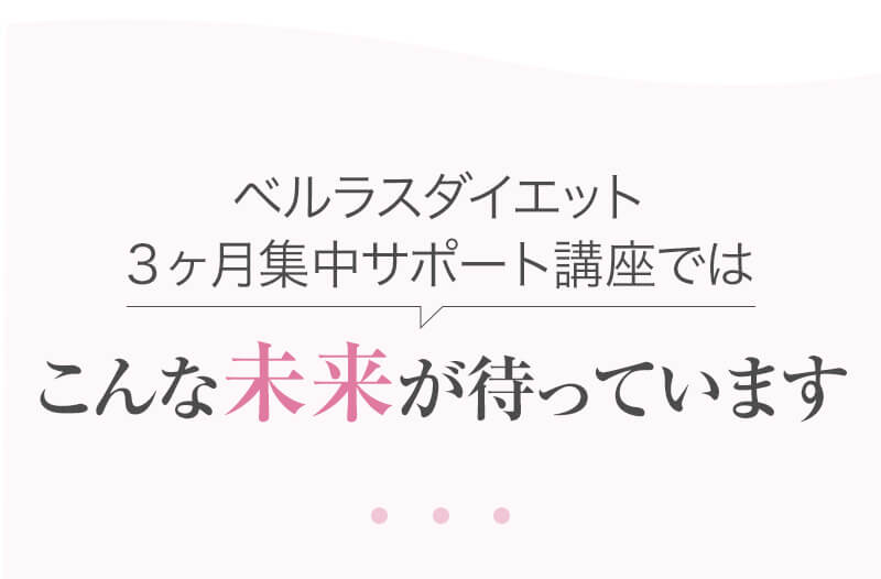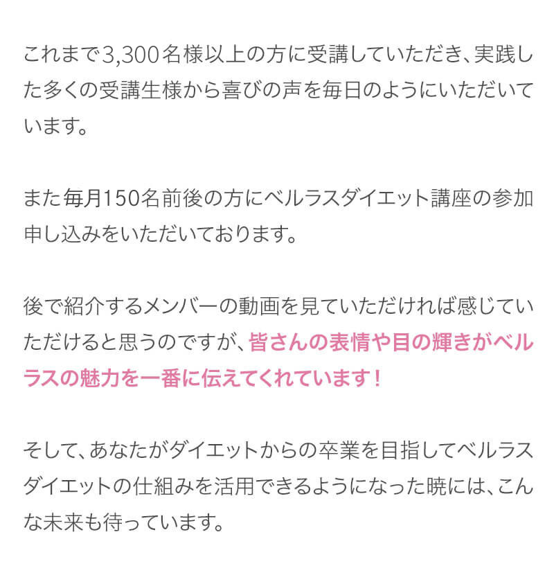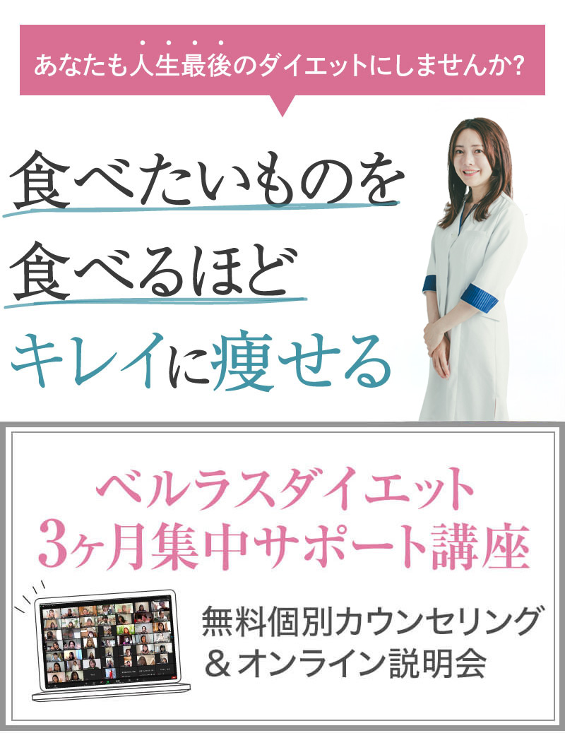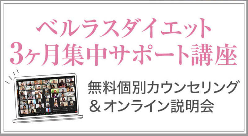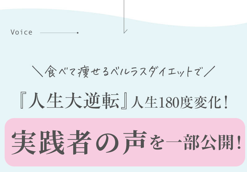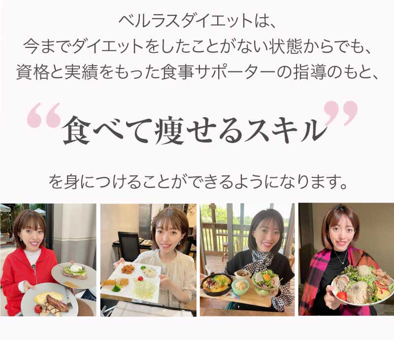 ▼ 続きを読む 小さい頃から大きかったので、ずっと極端なダイエットを22年間繰り返してきました。食べないで5kg痩せて13kgリバウンドしてしまったりだとか…。どんどん苦しくなっていきました。そこから抜け出したくて調べているうちにベルラスダイエットに出会いました。お金も払ったけど、こんな食欲コントロールできない状態で、写真を撮っても、それ以外の物をどんどん食べてしまって、自分はサポートしてもらっても、ダイエットできなかったらどうしようという、不安がありました。始めてみたら、人に見てもらえるという安心感をすごく感じました。毎日笑顔で、ダイエットなんて忘れて暮らしていきたい!洋服を試着室とかで悩まずにパッと選んでパッと着ることができたら、なんていいだろう、と思って続けていくことができました。無理やりこうしましょう!というのは一切なくて、私が『こうした方がいい』って感じてそれを実行してる環境がありました。それを繰り返しているうちに変わっていくことができたので、すごい自信がつきました!私のように一生懸命にやりすぎて、八方塞がりになっている方や、育児でなかなか外に出られない方、自分のことに時間を費やせない方にオンラインで、寄り添っていただきながら受講できるのでオススメです! ▼ 続きを読む 常にダイエット情報を検索しているのに、食べ物を目の前にすると、満足するまで食べて尽くし、後悔を繰り返していました。年々太っていく自分が嫌になり、気が付いたら久しぶりに会う友人や親戚の集まりにも、仕事だからと言い訳をして会わないようになっていました。ネガティブな事ばかり考えていました。健康的な食事を色々実践していましたが、痩せる事もできず、旦那さんに八つ当たりを繰り返していました。本っっっ当に!面倒くさがりでズボラな性格の私にできるのだろうか?料理は得意ではないけど、続けることができるのかな?子供の頃からずぅっと肥満体型だったので、そんな私でも痩せて、しかも維持できるのだろうか?また仕事柄(医療関係)体の仕組みは理解しているので、納得してできる内容なのだろうか?と本当にたくさん不安はありました。が・・結果、もっと!!早く出会いたかったです。子供の頃からの便秘も解消されて、毎朝スッキリでるのが当たり前になりました。ずっと月経不順で薬を飲んでいましたが、自然に生理がくるようになりました!今は続けられた自分を誇りに思ってます。この経験は一生役に立つ内容なので、大切な家族の健康も守っていけると思います。今までのダイエットにウン百万円を浪費しても痩せられなかった私が、人生最後のダイエットにする事ができました。 ▼ 続きを読む 元々中学生になった頃からずっとぽっちゃりしていて、ずっとスリム体型に憧れていました。 一度、産後に小学生の頃のように痩せたので、家族からは、痩せているのが本当で、太ってくると、怠けているような目で見られていました。 勇気を出して飛び込んだからこそ、今の変われた自分に出会えました。 一歩踏み出して本当に良かったと感じています。 たった3ヶ月で体重−9.4kg、体脂肪率−10.8%、PMSや便秘、睡眠の質が劇的に改善され、疲れやすくてため息ばかりでしたがサプリを手放し、朝活ができるまでになりました。 日々、システムに写真を貼り付け、内容をチェックする事で、一日の自分がちゃんと必要な栄養を取れたのかどうかが分かって良かったです。これが良い週間となりました。 私はもう、ドツボにはまっている自分に充分気がついていましたので、この出会いを逃したら、一度の人生を後悔で終える事が目に見えていました。 そんな人生もう辞めたい、そう思い、ベルラスに駆け込みました。 それがたった数ヶ月前の事だとは、改めて自分で驚く程、今では心身の贅肉もすっかり落ちて、なりたい自分になれたことで、自信を持ってやりたい事に向き合えるようになりました。 ベルラスは、必ず寄り添ってくださり、時には思いの丈をぶつけても、必ず、くみ取ってくださいます。 ベルラスは、そんな暖かい場所です。 ▼ 続きを読む 様々なダイエットに手をつけて、ダイエットしてはリバウンドを繰り返していました。 食べるのが大好きなので1kg落とすのにも苦労する私が本当に痩せることができるのか、飽きっぽい私が3ヶ月継続することができるのかという不安がありました。 たった3ヶ月で体重−9.4kg、体脂肪率−10.8%、PMSや便秘、睡眠の質が劇的に改善され、疲れやすくてため息ばかりでしたが朝活ができるまでになりました。 イライラも減り前向きに考えられるようになりました。 マンツーマンでお食事サポートをしてもらえるので3ヶ月間継続することができました。テキストやシステムもしっかりしていたので専門学校に通っているような気分で楽しく学べました。私だけのダイエットではなく、家族や大切な人にも伝えて健康を守っていける一生ものの知識が身につ