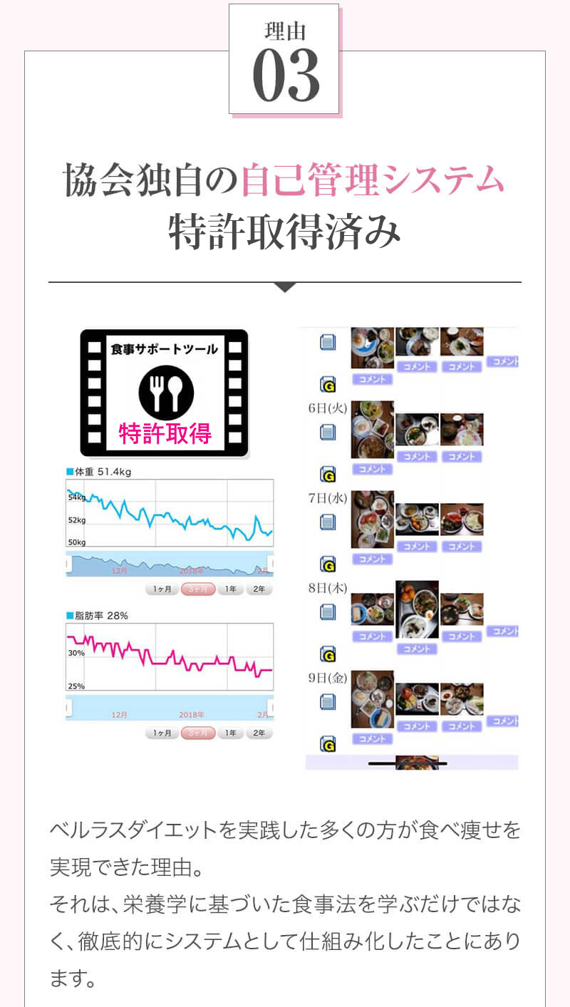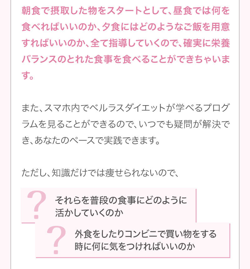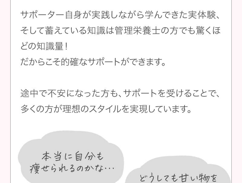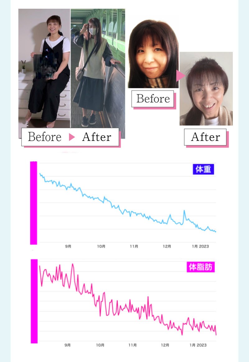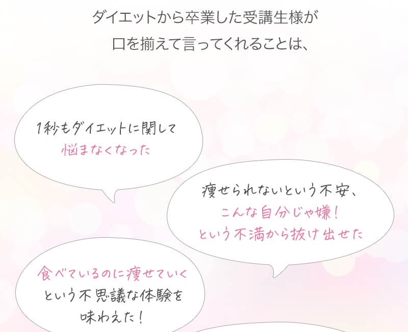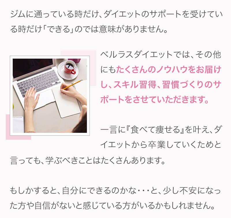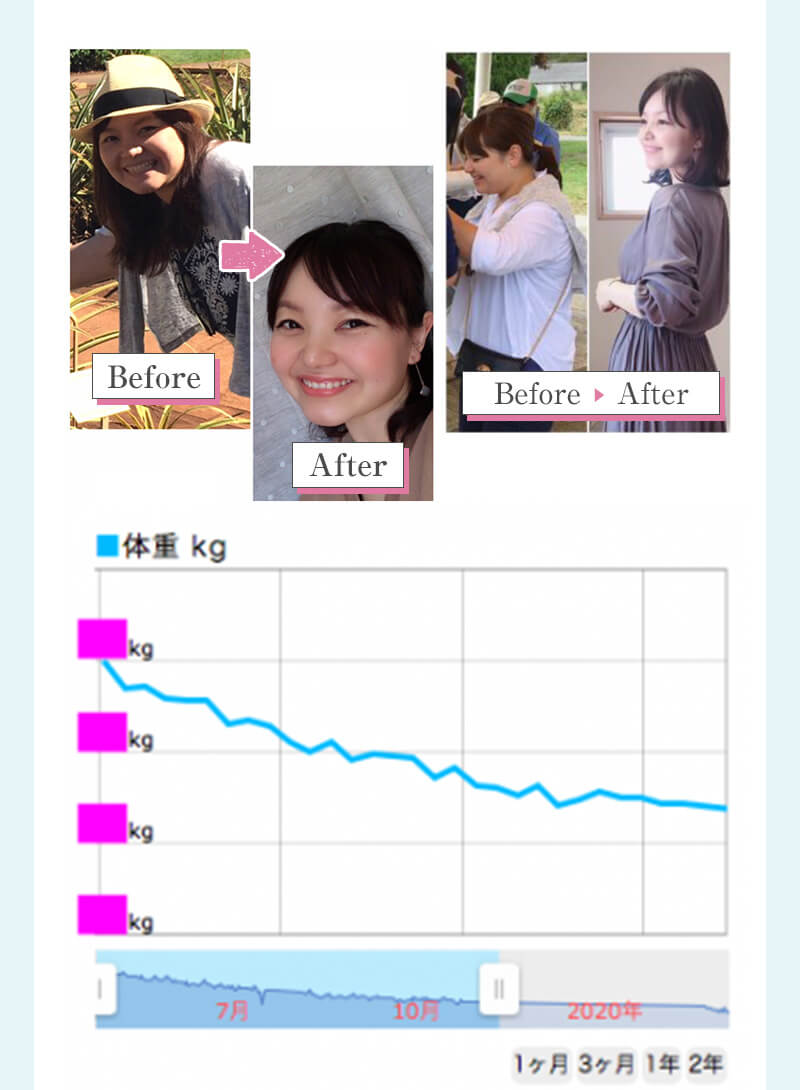 ▼ 続きを読む 小さい頃から大きかったので、ずっと極端なダイエットを22年間繰り返してきました。食べないで5kg痩せて13kgリバウンドしてしまったりだとか…。どんどん苦しくなっていきました。そこから抜け出したくて調べているうちにベルラスダイエットに出会いました。お金も払ったけど、こんな食欲コントロールできない状態で、写真を撮っても、それ以外の物をどんどん食べてしまって、自分はサポートしてもらっても、ダイエットできなかったらどうしようという、不安がありました。始めてみたら、人に見てもらえるという安心感をすごく感じました。毎日笑顔で、ダイエットなんて忘れて暮らしていきたい!洋服を試着室とかで悩まずにパッと選んでパッと着ることができたら、なんていいだろう、と思って続けていくことができました。無理やりこうしましょう!というのは一切なくて、私が『こうした方がいい』って感じてそれを実行してる環境がありました。それを繰り返しているうちに変わっていくことができたので、すごい自信がつきました!私のように一生懸命にやりすぎて、八方塞がりになっている方や、育児でなかなか外に出られない方、自分のことに時間を費やせない方にオンラインで、寄り添っていただきながら受講できるのでオススメです! ▼ 続きを読む 常にダイエット情報を検索しているのに、食べ物を目の前にすると、満足するまで食べて尽くし、後悔を繰り返していました。年々太っていく自分が嫌になり、気が付いたら久しぶりに会う友人や親戚の集まりにも、仕事だからと言い訳をして会わないようになっていました。ネガティブな事ばかり考えていました。健康的な食事を色々実践していましたが、痩せる事もできず、旦那さんに八つ当たりを繰り返していました。本っっっ当に!面倒くさがりでズボラな性格の私にできるのだろうか?料理は得意ではないけど、続けることができるのかな?子供の頃からずぅっと肥満体型だったので、そんな私でも痩せて、しかも維持できるのだろうか?また仕事柄(医療関係)体の仕組みは理解しているので、納得してできる内容なのだろうか?と本当にたくさん不安はありました。が・・結果、もっと!!早く出会いたかったです。子供の頃からの便秘も解消されて、毎朝スッキリでるのが当たり前になりました。ずっと月経不順で薬を飲んでいましたが、自然に生理がくるようになりました!今は続けられた自分を誇りに思ってます。この経験は一生役に立つ内容なので、大切な家族の健康も守っていけると思います。今までのダイエットにウン百万円を浪費しても痩せられなかった私が、人生最後のダイエットにする事ができました。 ▼ 続きを読む 元々中学生になった頃からずっとぽっちゃりしていて、ずっとスリム体型に憧れていました。 一度、産後に小学生の頃のように痩せたので、家族からは、痩せているのが本当で、太ってくると、怠けているような目で見られていました。 勇気を出して飛び込んだからこそ、今の変われた自分に出会えました。 一歩踏み出して本当に良かったと感じています。 たった3ヶ月で体重−9.4kg、体脂肪率−10.8%、PMSや便秘、睡眠の質が劇的に改善され、疲れやすくてため息ばかりでしたがサプリを手放し、朝活ができるまでになりました。 日々、システムに写真を貼り付け、内容をチェックする事で、一日の自分がちゃんと必要な栄養を取れたのかどうかが分かって良かったです。これが良い週間となりました。 私はもう、ドツボにはまっている自分に充分気がついていましたので、この出会いを逃したら、一度の人生を後悔で終える事が目に見えていました。 そんな人生もう辞めたい、そう思い、ベルラスに駆け込みました。 それがたった数ヶ月前の事だとは、改めて自分で驚く程、今では心身の贅肉もすっかり落ちて、なりたい自分になれたことで、自信を持ってやりたい事に向き合えるようになりました。 ベルラスは、必ず寄り添ってくださり、時には思いの丈をぶつけても、必ず、くみ取ってくださいます。 ベルラスは、そんな暖かい場所です。 ▼ 続きを読む 様々なダイエットに手をつけて、ダイエットしてはリバウンドを繰り返していました。 食べるのが大好きなので1kg落とすのにも苦労する私が本当に痩せることができるのか、飽きっぽい私が3ヶ月継続することができるのかという不安がありました。 たった3ヶ月で体重−9.4kg、体脂肪率−10.8%、PMSや便秘、睡眠の質が劇的に改善され、疲れやすくてため息ばかりでしたが朝活ができるまでになりました。 イライラも減り前向きに考えられるようになりました。 マンツーマンでお食事サポートをしてもらえるので3ヶ月間継続することができました。テキストやシステムもしっかりしていたので専門学校に通っているような気分で楽しく学べました。私だけのダイエットではなく、家族や大切な人にも伝えて健康を守っていける一生ものの知識が身につ