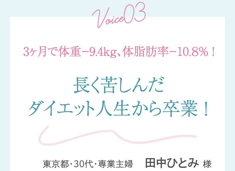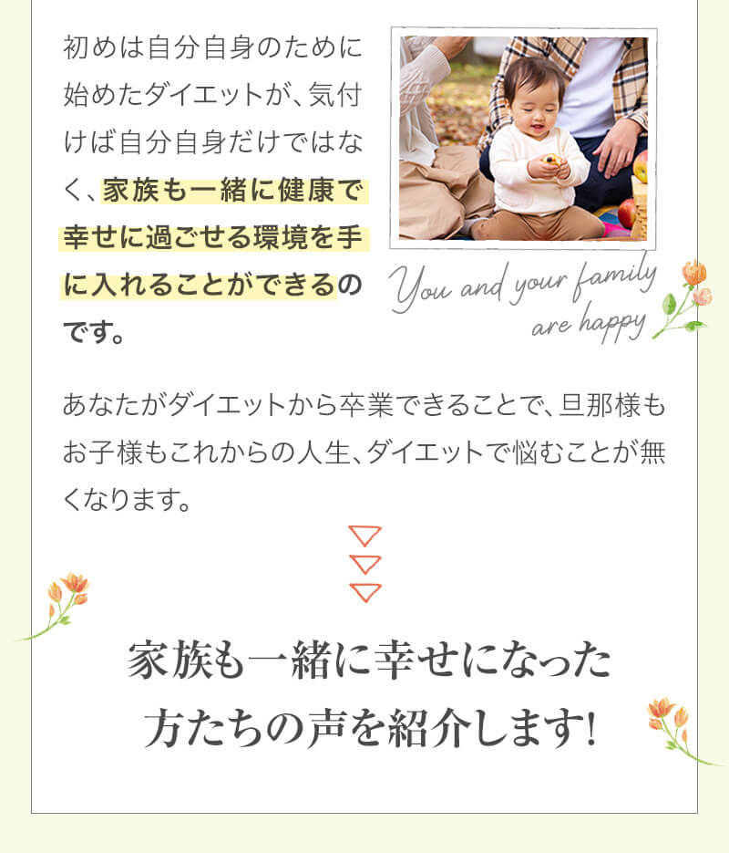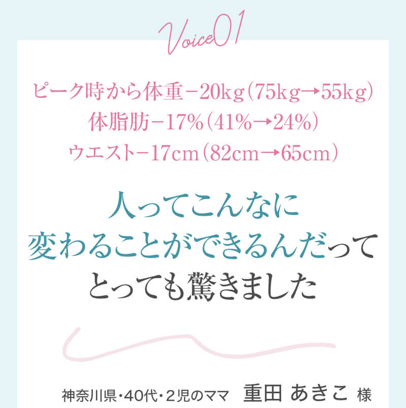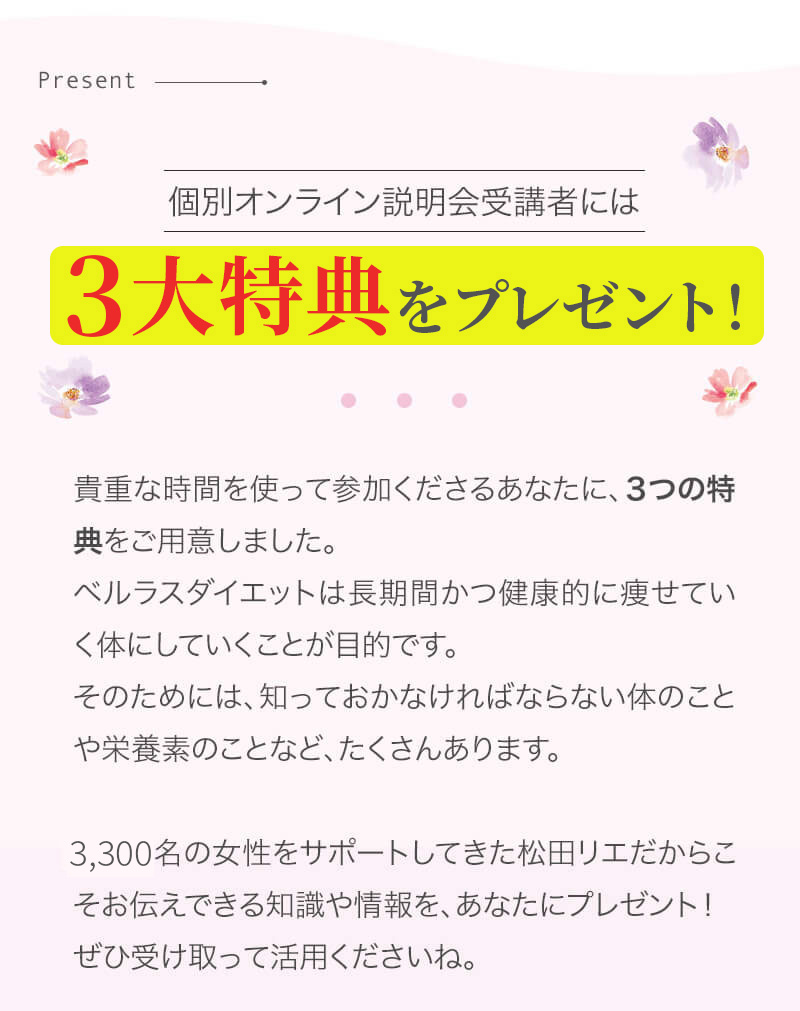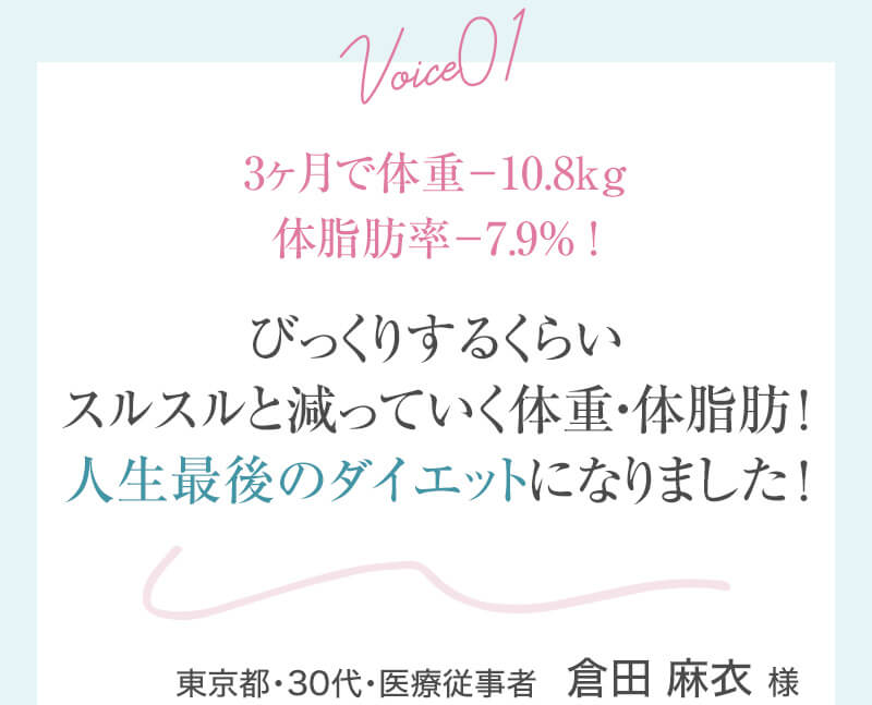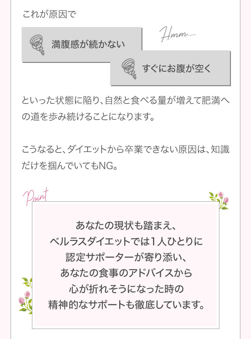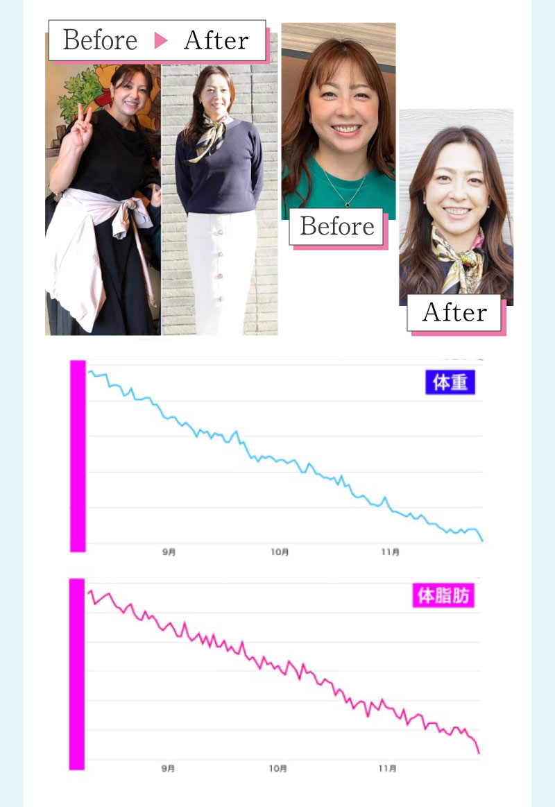 ▼ 続きを読む 小さい頃から大きかったので、ずっと極端なダイエットを22年間繰り返してきました。食べないで5kg痩せて13kgリバウンドしてしまったりだとか…。どんどん苦しくなっていきました。そこから抜け出したくて調べているうちにベルラスダイエットに出会いました。お金も払ったけど、こんな食欲コントロールできない状態で、写真を撮っても、それ以外の物をどんどん食べてしまって、自分はサポートしてもらっても、ダイエットできなかったらどうしようという、不安がありました。始めてみたら、人に見てもらえるという安心感をすごく感じました。毎日笑顔で、ダイエットなんて忘れて暮らしていきたい!洋服を試着室とかで悩まずにパッと選んでパッと着ることができたら、なんていいだろう、と思って続けていくことができました。無理やりこうしましょう!というのは一切なくて、私が『こうした方がいい』って感じてそれを実行してる環境がありました。それを繰り返しているうちに変わっていくことができたので、すごい自信がつきました!私のように一生懸命にやりすぎて、八方塞がりになっている方や、育児でなかなか外に出られない方、自分のことに時間を費やせない方にオンラインで、寄り添っていただきながら受講できるのでオススメです! ▼ 続きを読む 常にダイエット情報を検索しているのに、食べ物を目の前にすると、満足するまで食べて尽くし、後悔を繰り返していました。年々太っていく自分が嫌になり、気が付いたら久しぶりに会う友人や親戚の集まりにも、仕事だからと言い訳をして会わないようになっていました。ネガティブな事ばかり考えていました。健康的な食事を色々実践していましたが、痩せる事もできず、旦那さんに八つ当たりを繰り返していました。本っっっ当に!面倒くさがりでズボラな性格の私にできるのだろうか?料理は得意ではないけど、続けることができるのかな?子供の頃からずぅっと肥満体型だったので、そんな私でも痩せて、しかも維持できるのだろうか?また仕事柄(医療関係)体の仕組みは理解しているので、納得してできる内容なのだろうか?と本当にたくさん不安はありました。が・・結果、もっと!!早く出会いたかったです。子供の頃からの便秘も解消されて、毎朝スッキリでるのが当たり前になりました。ずっと月経不順で薬を飲んでいましたが、自然に生理がくるようになりました!今は続けられた自分を誇りに思ってます。この経験は一生役に立つ内容なので、大切な家族の健康も守っていけると思います。今までのダイエットにウン百万円を浪費しても痩せられなかった私が、人生最後のダイエットにする事ができました。 ▼ 続きを読む 元々中学生になった頃からずっとぽっちゃりしていて、ずっとスリム体型に憧れていました。 一度、産後に小学生の頃のように痩せたので、家族からは、痩せているのが本当で、太ってくると、怠けているような目で見られていました。 勇気を出して飛び込んだからこそ、今の変われた自分に出会えました。 一歩踏み出して本当に良かったと感じています。 たった3ヶ月で体重−9.4kg、体脂肪率−10.8%、PMSや便秘、睡眠の質が劇的に改善され、疲れやすくてため息ばかりでしたがサプリを手放し、朝活ができるまでになりました。 日々、システムに写真を貼り付け、内容をチェックする事で、一日の自分がちゃんと必要な栄養を取れたのかどうかが分かって良かったです。これが良い週間となりました。 私はもう、ドツボにはまっている自分に充分気がついていましたので、この出会いを逃したら、一度の人生を後悔で終える事が目に見えていました。 そんな人生もう辞めたい、そう思い、ベルラスに駆け込みました。 それがたった数ヶ月前の事だとは、改めて自分で驚く程、今では心身の贅肉もすっかり落ちて、なりたい自分になれたことで、自信を持ってやりたい事に向き合えるようになりました。 ベルラスは、必ず寄り添ってくださり、時には思いの丈をぶつけても、必ず、くみ取ってくださいます。 ベルラスは、そんな暖かい場所です。 ▼ 続きを読む 様々なダイエットに手をつけて、ダイエットしてはリバウンドを繰り返していました。 食べるのが大好きなので1kg落とすのにも苦労する私が本当に痩せることができるのか、飽きっぽい私が3ヶ月継続することができるのかという不安がありました。 たった3ヶ月で体重−9.4kg、体脂肪率−10.8%、PMSや便秘、睡眠の質が劇的に改善され、疲れやすくてため息ばかりでしたが朝活ができるまでになりました。 イライラも減り前向きに考えられるようになりました。 マンツーマンでお食事サポートをしてもらえるので3ヶ月間継続することができました。テキストやシステムもしっかりしていたので専門学校に通っているような気分で楽しく学べました。私だけのダイエットではなく、家族や大切な人にも伝えて健康を守っていける一生ものの知識が身につ