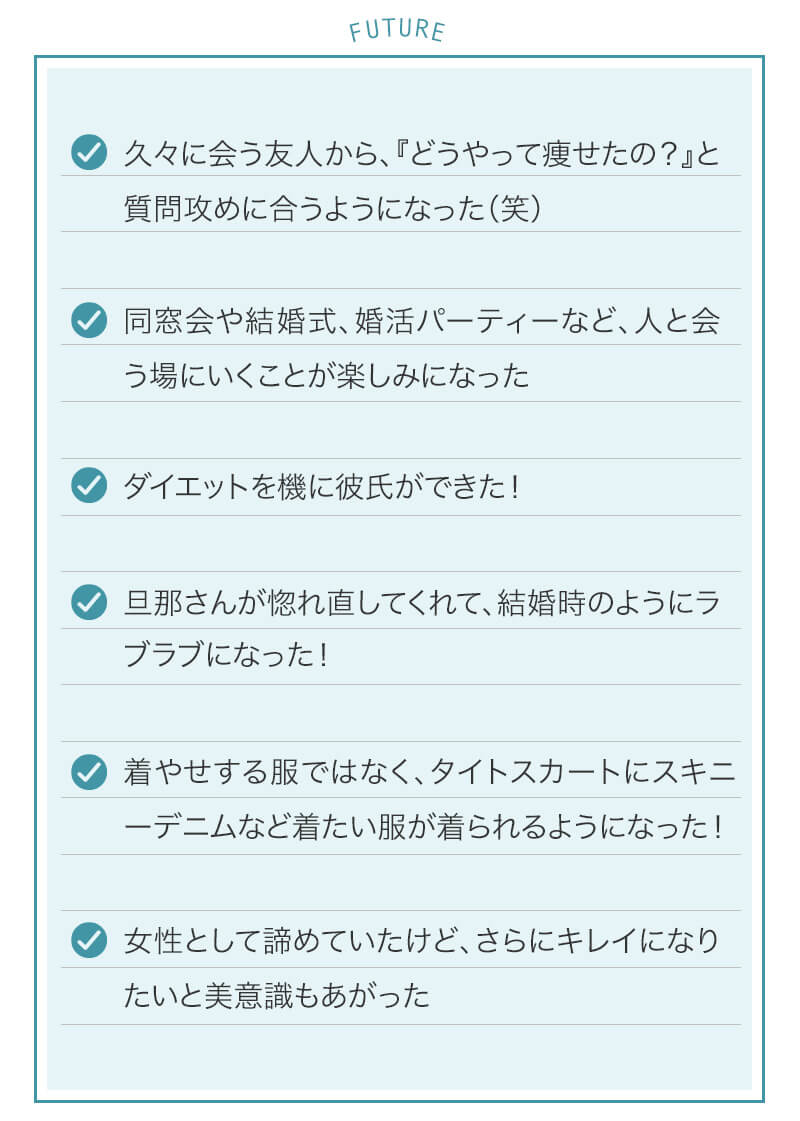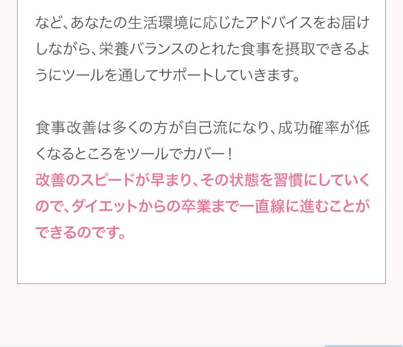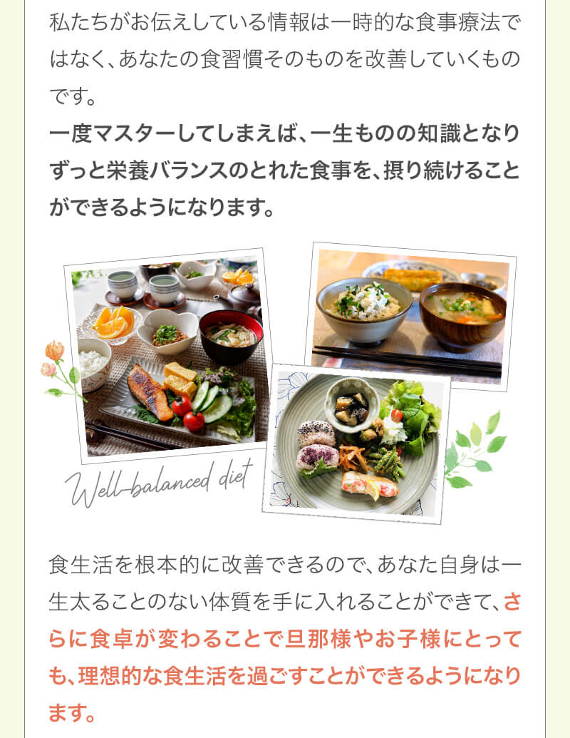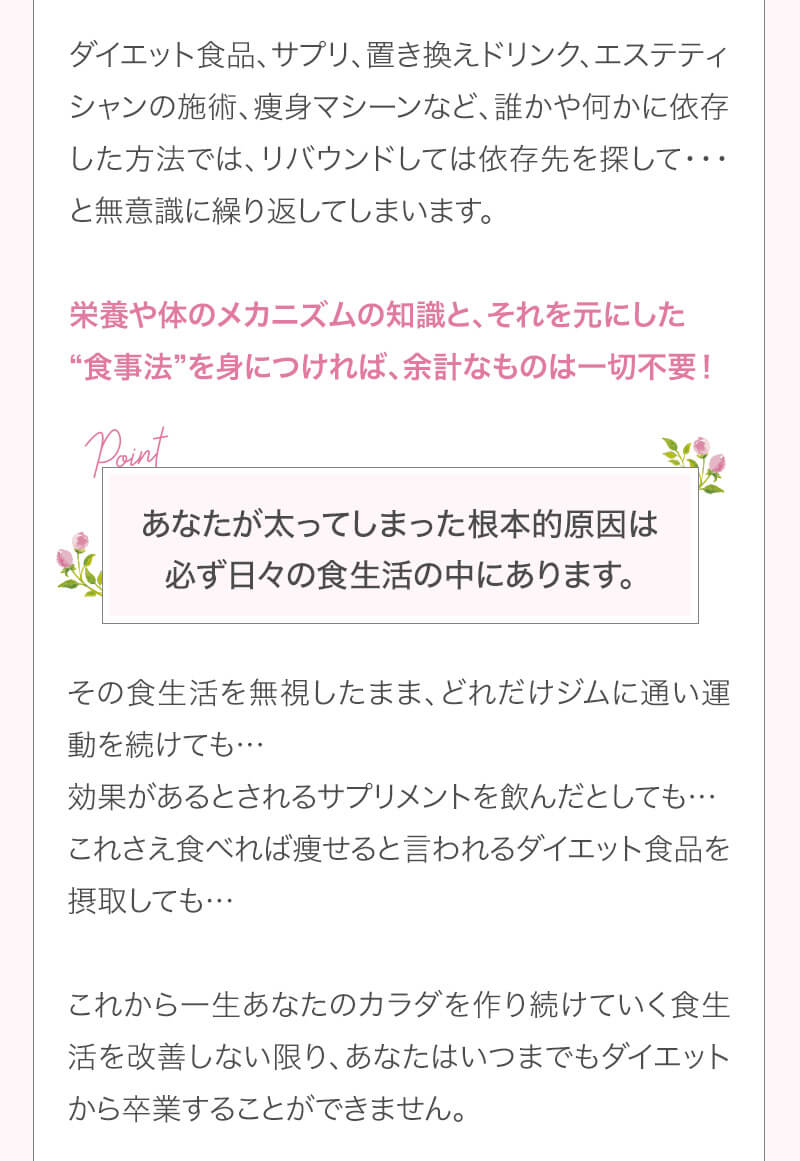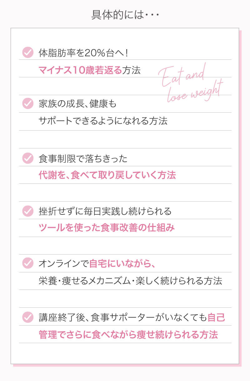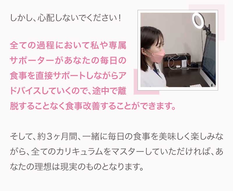 ▼ 続きを読む 小さい頃から大きかったので、ずっと極端なダイエットを22年間繰り返してきました。食べないで5kg痩せて13kgリバウンドしてしまったりだとか…。どんどん苦しくなっていきました。そこから抜け出したくて調べているうちにベルラスダイエットに出会いました。お金も払ったけど、こんな食欲コントロールできない状態で、写真を撮っても、それ以外の物をどんどん食べてしまって、自分はサポートしてもらっても、ダイエットできなかったらどうしようという、不安がありました。始めてみたら、人に見てもらえるという安心感をすごく感じました。毎日笑顔で、ダイエットなんて忘れて暮らしていきたい!洋服を試着室とかで悩まずにパッと選んでパッと着ることができたら、なんていいだろう、と思って続けていくことができました。無理やりこうしましょう!というのは一切なくて、私が『こうした方がいい』って感じてそれを実行してる環境がありました。それを繰り返しているうちに変わっていくことができたので、すごい自信がつきました!私のように一生懸命にやりすぎて、八方塞がりになっている方や、育児でなかなか外に出られない方、自分のことに時間を費やせない方にオンラインで、寄り添っていただきながら受講できるのでオススメです! ▼ 続きを読む 常にダイエット情報を検索しているのに、食べ物を目の前にすると、満足するまで食べて尽くし、後悔を繰り返していました。年々太っていく自分が嫌になり、気が付いたら久しぶりに会う友人や親戚の集まりにも、仕事だからと言い訳をして会わないようになっていました。ネガティブな事ばかり考えていました。健康的な食事を色々実践していましたが、痩せる事もできず、旦那さんに八つ当たりを繰り返していました。本っっっ当に!面倒くさがりでズボラな性格の私にできるのだろうか?料理は得意ではないけど、続けることができるのかな?子供の頃からずぅっと肥満体型だったので、そんな私でも痩せて、しかも維持できるのだろうか?また仕事柄(医療関係)体の仕組みは理解しているので、納得してできる内容なのだろうか?と本当にたくさん不安はありました。が・・結果、もっと!!早く出会いたかったです。子供の頃からの便秘も解消されて、毎朝スッキリでるのが当たり前になりました。ずっと月経不順で薬を飲んでいましたが、自然に生理がくるようになりました!今は続けられた自分を誇りに思ってます。この経験は一生役に立つ内容なので、大切な家族の健康も守っていけると思います。今までのダイエットにウン百万円を浪費しても痩せられなかった私が、人生最後のダイエットにする事ができました。 ▼ 続きを読む 元々中学生になった頃からずっとぽっちゃりしていて、ずっとスリム体型に憧れていました。 一度、産後に小学生の頃のように痩せたので、家族からは、痩せているのが本当で、太ってくると、怠けているような目で見られていました。 勇気を出して飛び込んだからこそ、今の変われた自分に出会えました。 一歩踏み出して本当に良かったと感じています。 たった3ヶ月で体重−9.4kg、体脂肪率−10.8%、PMSや便秘、睡眠の質が劇的に改善され、疲れやすくてため息ばかりでしたがサプリを手放し、朝活ができるまでになりました。 日々、システムに写真を貼り付け、内容をチェックする事で、一日の自分がちゃんと必要な栄養を取れたのかどうかが分かって良かったです。これが良い週間となりました。 私はもう、ドツボにはまっている自分に充分気がついていましたので、この出会いを逃したら、一度の人生を後悔で終える事が目に見えていました。 そんな人生もう辞めたい、そう思い、ベルラスに駆け込みました。 それがたった数ヶ月前の事だとは、改めて自分で驚く程、今では心身の贅肉もすっかり落ちて、なりたい自分になれたことで、自信を持ってやりたい事に向き合えるようになりました。 ベルラスは、必ず寄り添ってくださり、時には思いの丈をぶつけても、必ず、くみ取ってくださいます。 ベルラスは、そんな暖かい場所です。 ▼ 続きを読む 様々なダイエットに手をつけて、ダイエットしてはリバウンドを繰り返していました。 食べるのが大好きなので1kg落とすのにも苦労する私が本当に痩せることができるのか、飽きっぽい私が3ヶ月継続することができるのかという不安がありました。 たった3ヶ月で体重−9.4kg、体脂肪率−10.8%、PMSや便秘、睡眠の質が劇的に改善され、疲れやすくてため息ばかりでしたが朝活ができるまでになりました。 イライラも減り前向きに考えられるようになりました。 マンツーマンでお食事サポートをしてもらえるので3ヶ月間継続することができました。テキストやシステムもしっかりしていたので専門学校に通っているような気分で楽しく学べました。私だけのダイエットではなく、家族や大切な人にも伝えて健康を守っていける一生ものの知識が身につ