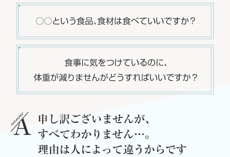 ベルラスダイエットは『○○すれば痩せる!』という短絡的なダイエットではないので、LINEやメールで抽象的なご質問をいただいても短絡的なアドバイスはできませんのでご了承お願いします。